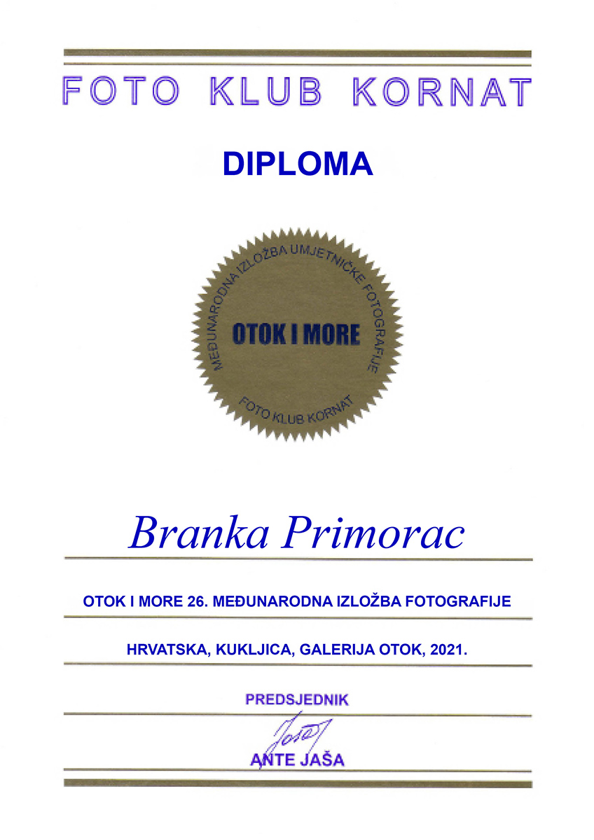 Na ovogodišnjem međunarodnom natječaju umjetničke fotografije Otok i more Fotokluba Kornat jedna moja crno-bijela fotografija, portret Zlatka Krilića nagrađena je diplomom Honorable mention, a četiri su uvrštene za izlaganje.