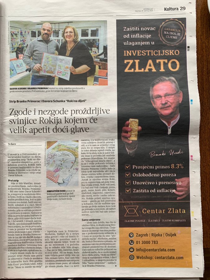 Šesto, Schunk, Primorac, trojac koji je informirao i zabavljao publiku, otvorio je raspravu o tome je li knjiga pred nama slikovnica ili strip ili možda žanrovski hibrid koja je zaživjela na dobar način. Svatko je ostao kod svog mišljenja, ali važno je da smo se složili da bi to mogla biti priča koja će djecu zainteresirati i poučiti nečemu. A što je tema stripa Roki na dijeti? Naslov puno govori, a priča ukratko ide ovako. Svinja Roki već je dobio toliko na vagi da njegov vlasnik mesar ima neke ozbiljne planove s njim. Roki je protiv. Bježi od gazde i traži pomoć od prvih susjedica, kozica Mirte i Marte. Upada u nastambu premalenu za ogromnog prasca, ruši sve pred sobom i ometa sestre u pijenju čaja. Kad naleti gazda tražeći svoju žrtvu, sestre ga sakriju iza frižidera. Situacija se naizgled smiruje, ali kad treba početi suživot svinje i koza, nastaju problemi zbog različitih jelovnika i količine hrane na tanjuru. Veliki problemi! Ali o tome tko je popustio i prihvatio teške uvjete sustanarstva pročitajte u knjizi.