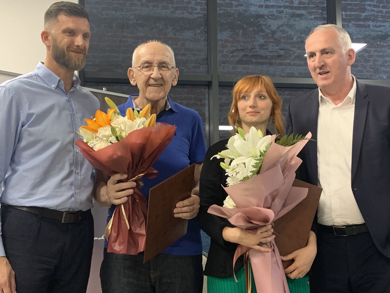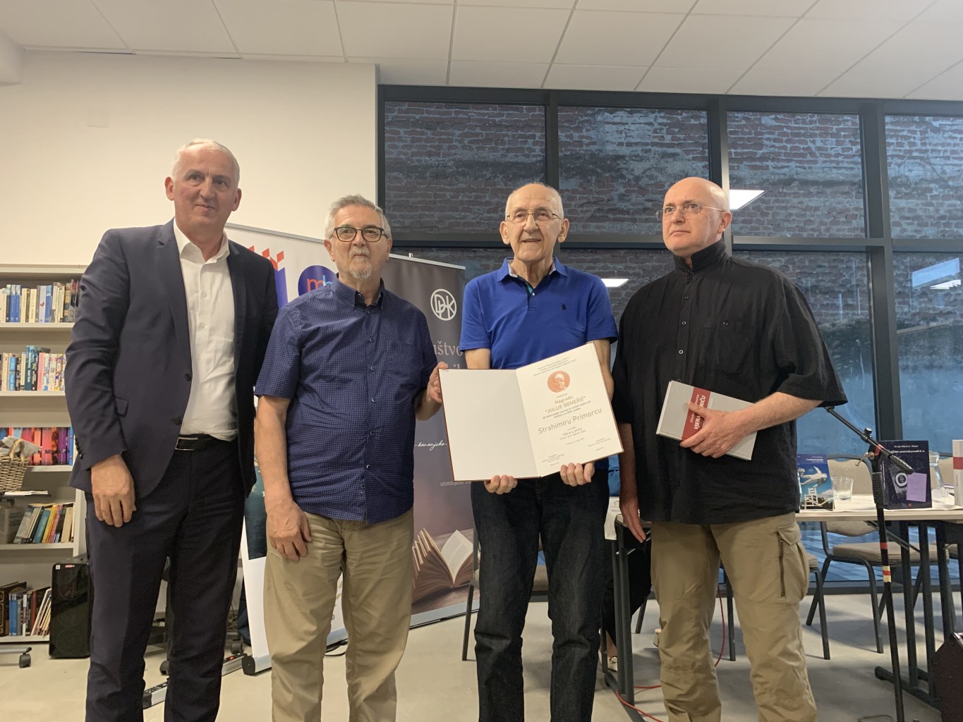- Mirko Ćurić i članovi žirija Josip Cvenić, član, i predsjednik dr. Goran Rem s dobitnikom Nagrade 'Julije Benešić'