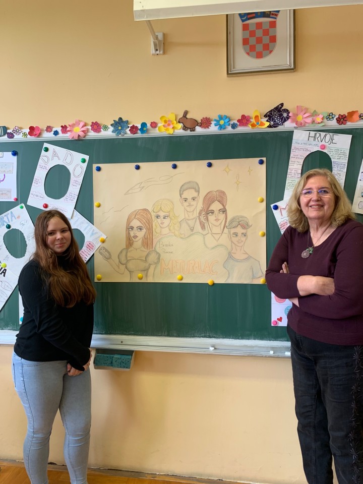 Za pola sata moramo biti u školi u Josipovcu, a tamo u velikoj prostoriji ludilo od varijanti naslovnice Maturalca, a na velikoj ploči od zida do zida portreti glavnih likova. Uslijedio je dirljiv susret s autoricom crteža Gabrijelom Najbauer, tihom, skromnom i talentiranom učenicom VIII. razreda. Fotografiramo se ispred njezina velikog crteža, razmjenjujemo podatke i sad smo frendice na Facebooku. Čvrsta veza je uspostavljena.