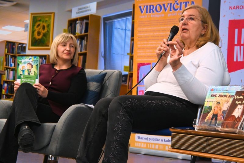 Puni dojmova završavamo turneju u lijepoj Gradskoj knjižnici u Virovitici, koja me ugostila i prije trinaest godina kad je to bila posve novi prostor. I danas je lijep kao što je bio. Susret sa spisateljicom moderira knjižničarka Mirjana Kotromanović. Uživam u njezinim pitanjima, čuje se da se dobro pripremila. Lijepo se nadopunjavamo, auditorij pomno prati o čemu razgovaramo, a razgovaramo najvećim dijelom o najnovijoj knjizi za djecu Marin i Sarin čarobni vrt, kojoj je glavna tema ekologija. Uključuju se s pitanjima. Na pravom sam mjestu, unutrašnjost knjižnice puna je knjiga, što se podrazumijeva, ali i pomno njegovanih biljaka. Samo slijep čovjek ne bi vidio svud uokolo tu zdravu zelenu divotu i uz jedan od zidova knjižnice. Da slučajno ostane nezamijećena ne dopušta knjižničarka Mirjana: