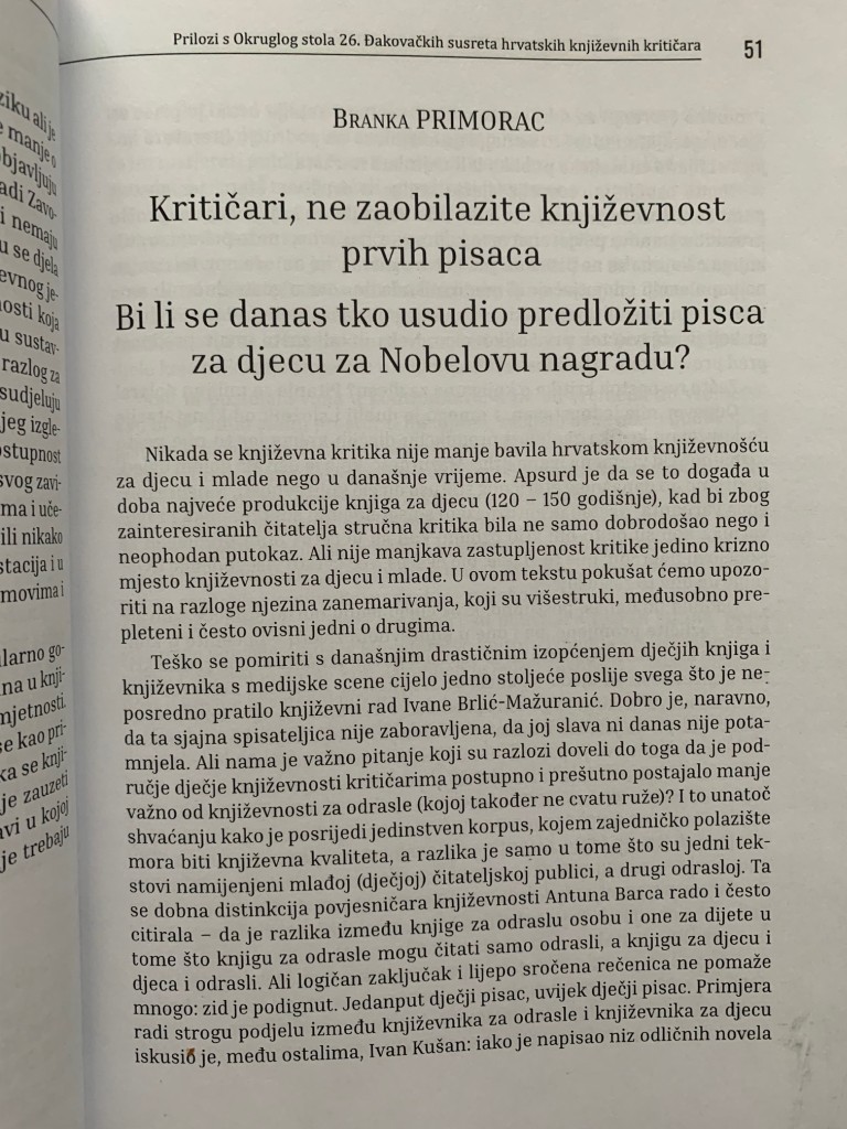 Ovo je uvod u tekst koji stavljam na web stranicu, a koji je objavljen u zborniku 27. Đakovačkih susreta hrvatskih književnih kritičara 2023. i tiče se odnosa književne kritike prema književnosti za djecu i mlade. Budući da i publikacije poput ove ne dopiru do šire publike uvrstila sam ga na svoju stranicu. Ništa tu nema novo što se ne zna, ali najgore je šutjeti pa makar ostane isto kao što je bilo. Jedan žižak se u međuvremenu upalio, objavljen je prvi broj časopisa za dječju književnost Društva hrvatskih književnika, kakav smo već imali pa se ugasio. Zato ovome poželimo da poživi dugo, dugo. To je bolje nego ništa, ali kap u moru onoga što kvalitetnoj knjizi treba da bi došla do čitatelja.