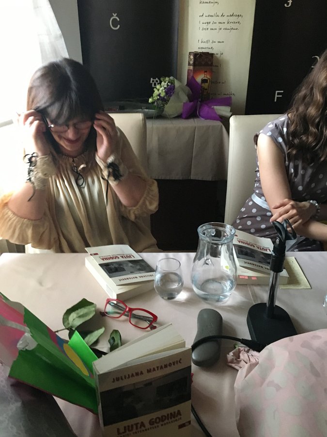 Tri su predstavljačice – urednica Vanja Kulaš i dvije bivše Julijanine studentice, Antonija Ćosić i Andrea Divić – svaka na svoj način govorile o knjizi i o profesorici. Ćosić i Divić dobar dio obraćanja publici posvetile su njezinu iznenadnom odlasku u mirovinu i preseljenju u Osijek, potom I razočaranju sredinom od koje je mnogo očekivala. Nisu pretjerale u opisima privatnog života doktorice suvremene hrvatske književnosti, profesorice u miru, što bi bilo neumjesno da nije povezano sa Zapisima internetske novakinje, kako glasi podnaslov knjige. Psihologinja Antonija Ćosić profesionalnim je kategorijama opisala što se to zapravo dogodilo. Prof. Matanović imala je visoka očekivanja od Osijeka, rekla je, mi pak osjećaj da smo izgubili Julijanu, a onda je ona izgubila Osijek i vratila se u Zagreb. Međutim, nije potonula, već je iz poraza izašla jača nego prije.