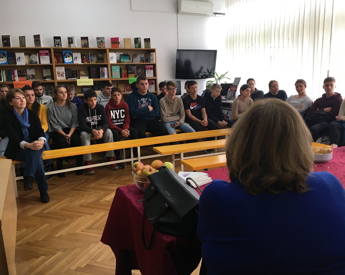 Poslije osvježenja, po suncem obasjanom parku, lijepom danu između dva ružna, prošetali smo svi do Srednje škole Ivan Švear u kojoj smo s gimnazijalcima drugih razreda razgovarali na temu: postaje li književnost za djecu bliska i odraslima? Moderatorica je uz Jadranka Bitenca bila knjižničarka Višnja Jeren. Pisci su kratko govorili o svom radu, iskustvu koje imaju s djecom čitateljima, odnosno odraslima. Spomenula sam odavno izrečenu tvrdnju da dječju knjigu mogu čitati i djeca i odrasli, a knjigu za odrasle samo odrasli. Ima naravno izuzetaka, a primjer može biti moja romansirana biografija „Rudolf Perešin – život i smrt“ koja je spominjana na druženju. S razlogom. Naime, Perešin je do petnaeste godine, do odlaska na školovanje za pilota živio nedaleko Ivanića i tu završio osnovnu školu. Razveselilo me da ivanićgradski gimnazijalci znaju tko je Perešin kraj čije biste prolaze svaki dan do škole. Sigurna sam, taj roman, oni pa i mlađi, osobito zaljubljenici u letenje i uzbudljive ratne priče naših heroja, mogu čitati s razumijevanjem. U jednoj fazi izrade kurikuluma „Škole za život“ taj je naslov bio na popisu lektire za najviši modul, a onda je nestao. Otom, potom.