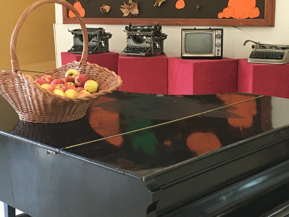 Ugodno druženje nikada ne završava kad netko obznani da je isteklo vrijeme. Učenici su otišli na nastavu, ali priča se nastavila s knjižničarkom Višnjom, prvo u knjižnici pa u zanimljivo uređenom predvorju škole koje je nalik velikom dnevnom boravku. Stolići s košarama puni jabuka, uz njih jarko žute vesele fotelje i učenici na internetu ili u razgovoru s kolegama. U sredini veliki koncertni glasovir opet s košarom voća, a do njega dugačko postolje s pisaćim mašinama, starim toliko da ih nisam zatekla u redakciji ni kada sam ja počinjala u novinarstvu, te jedan gramofon iz moje mladosti s kojeg smo puštali pjesme Beatlesa, Pat Boonea, Rolling Stonesa…